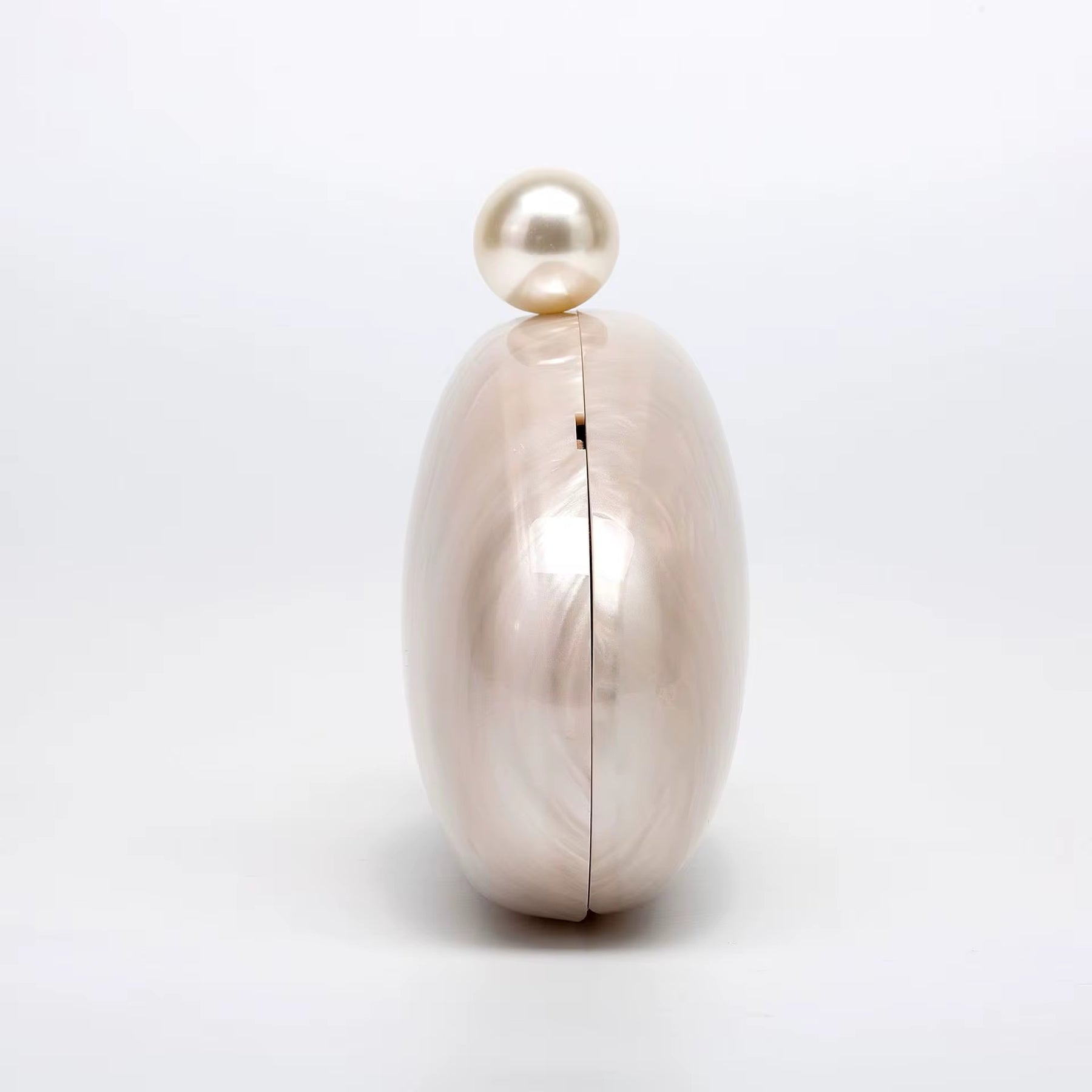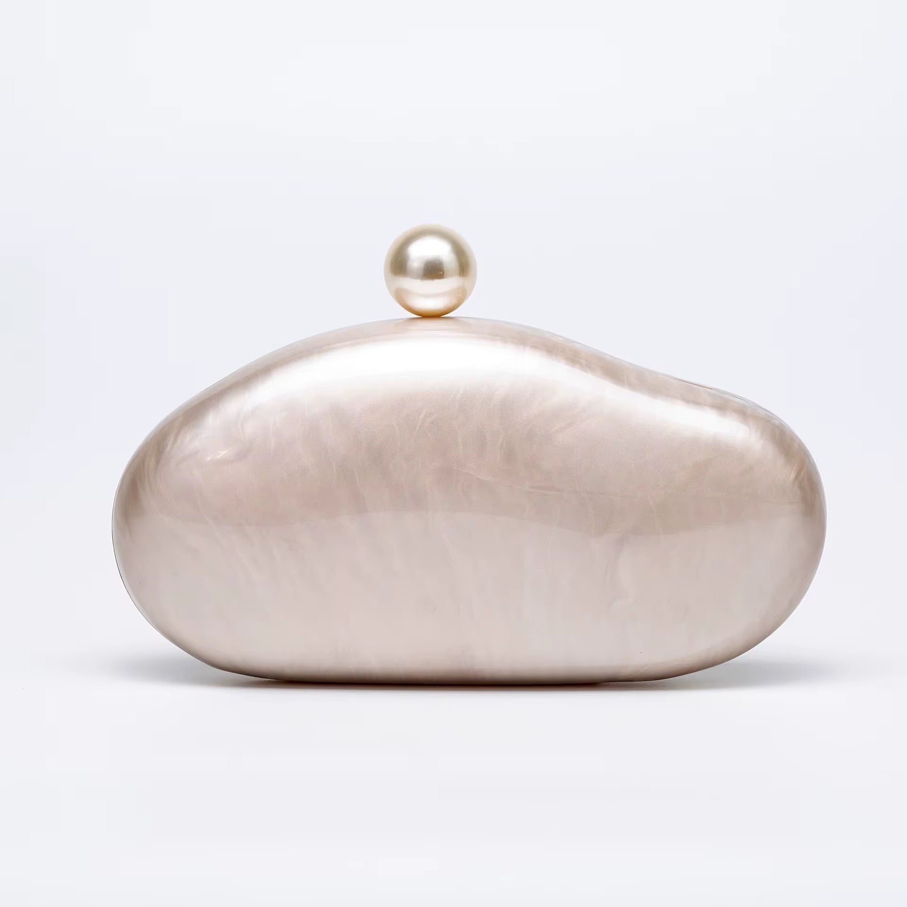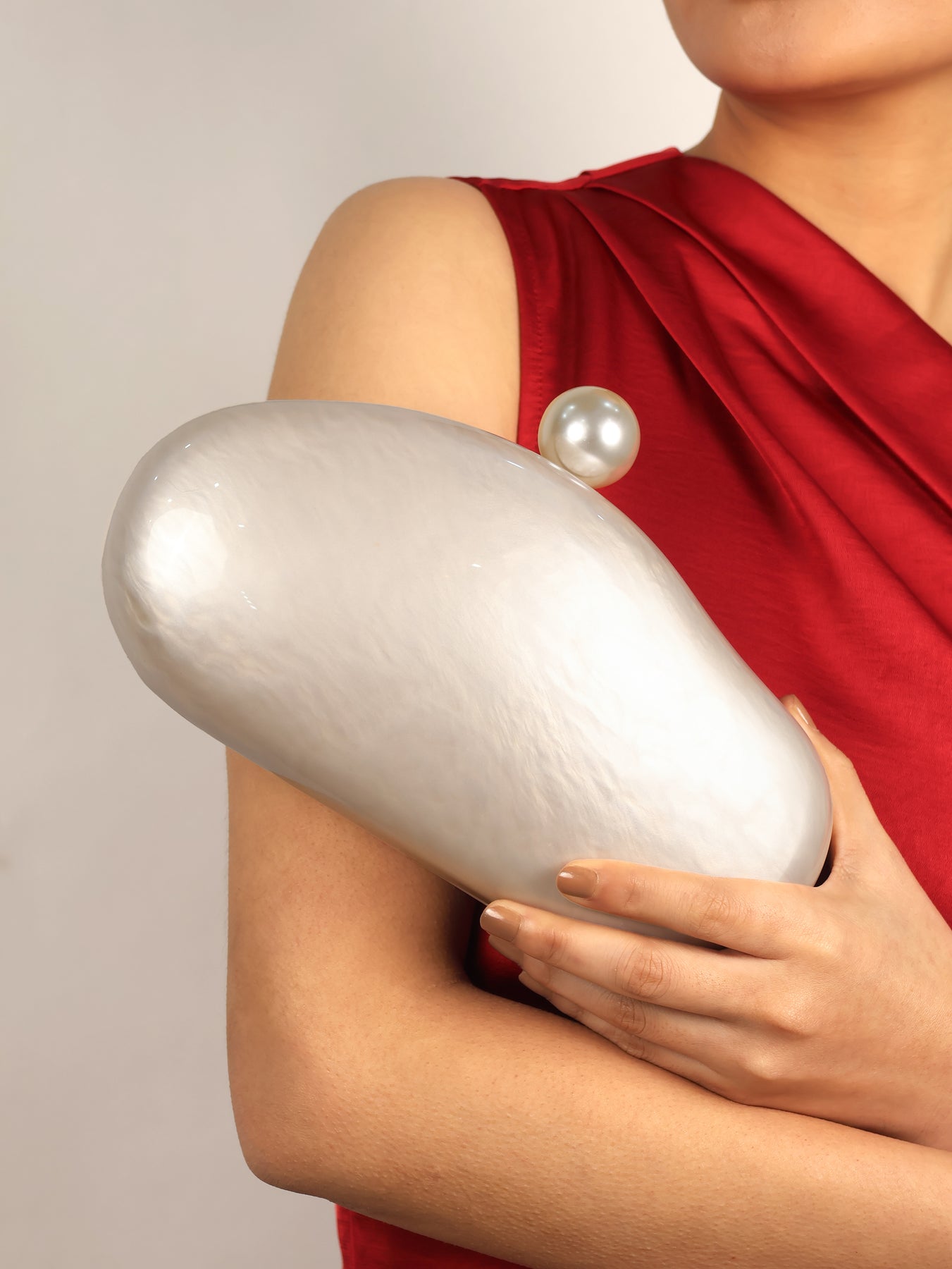 Crafted in a lustrous, pearl-finish acrylic resin, its fluid arched form feels both modern and timeless. The sculptural shape sits effortlessly in hand, while the sleek metallic clasp adds a refined edge. Finished with a detachable chain, it transitions seamlessly from handheld elegance to hands-free ease.