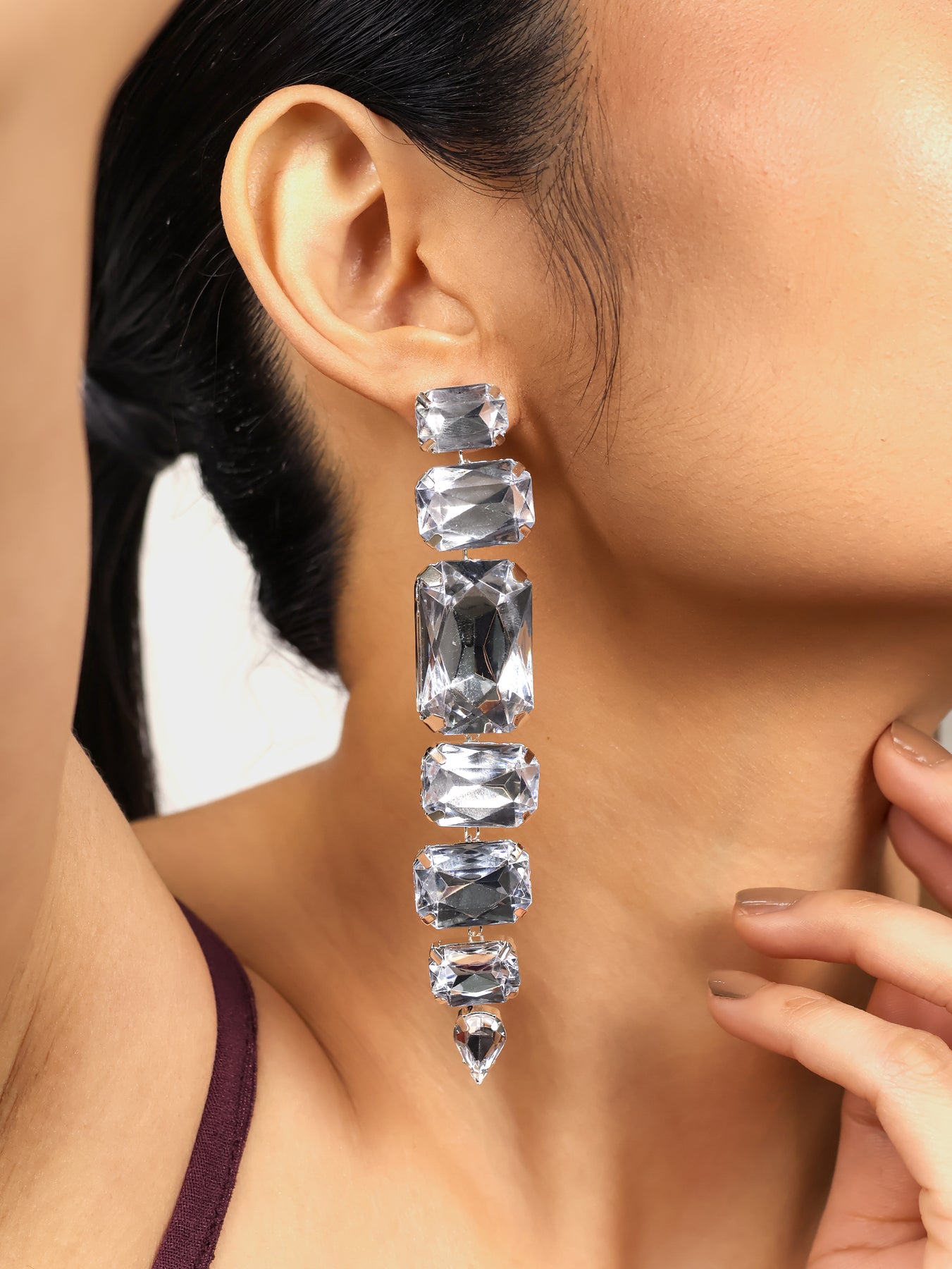 These crystal drop earrings are designed to own the spotlight. Featuring a sleek vertical arrangement of faceted clear crystals, each stone is precision-cut to reflect light from every angle. The structured silhouette gives major runway energy, while the cascading sparkle adds timeless elegance.
